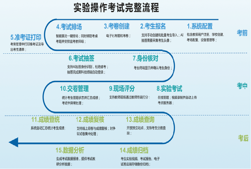 考前部分:建立考试场地→→创建实验考试基本信息→→选择考卷和分配监考教师→→生成考试通知→→考务管理教师审核→→考试证件生成打印